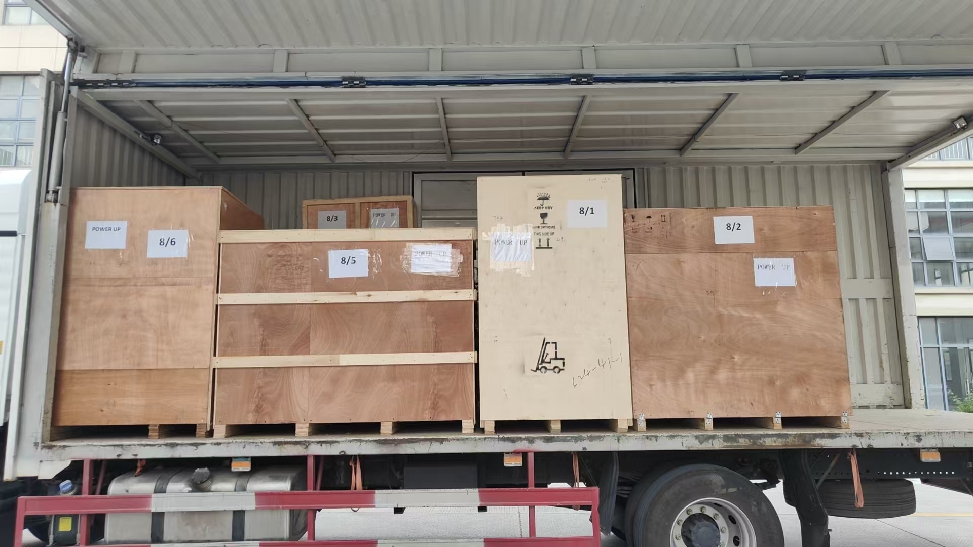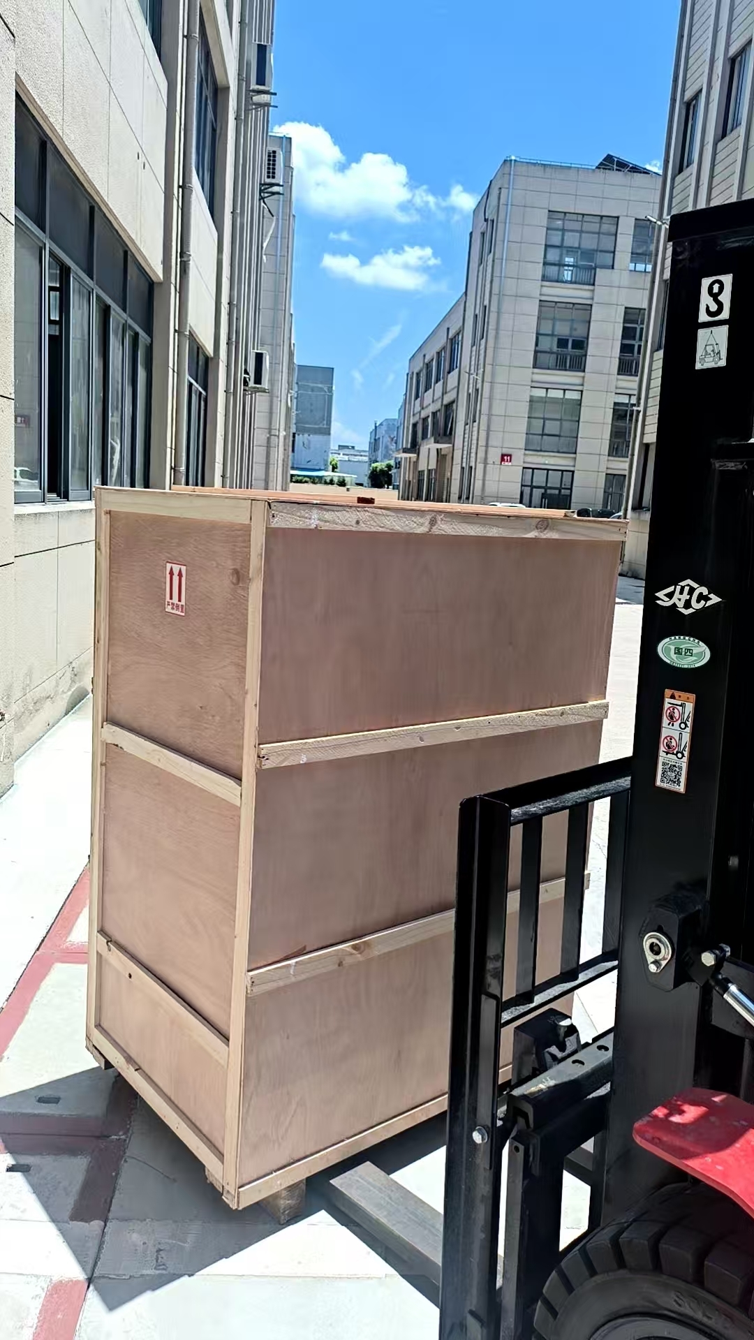 現場可見,貨物采用定制熏蒸木箱包裝,箱體標注清晰的批次編號、操作標識及防護提示,適配國際長途運輸的倉儲與裝卸規范。這批設備將用于英國客戶的生產線升級,匹配其在制藥環節的精細化生產需求。